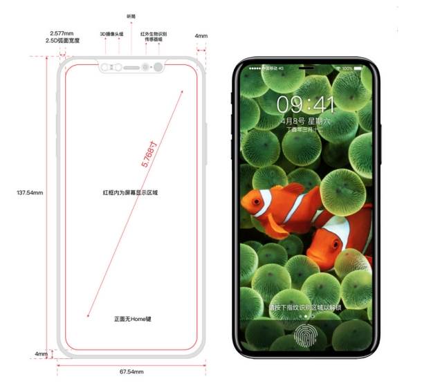 Šematski dijagram navodno iz Foxconn fabrike se pojavio, prikazujući telefon za koji tvrde da je u pitanju finalni dizajn modela za desetogodišnjicu, Apple iPhone 8. Za dijagram kažu da je onaj pravi, korišćen u proizvodnom procesu kao pomoć pri sklapanju uređaja, koji bi trebao da ima OLED ekran od 5.8 inča i 2.5D staklo. Kako je ranije javljeno, prednja kamera iPhone 8 telefona bi trebala imati 3D skener sa mogućnostima prepoznavanja lica. Apple bi mogao imati probleme u toku proizvodnje ove tehnologije, što je jedan od razloga zbog mogućeg kašnjenja telefona, prenosi phoneArena.
