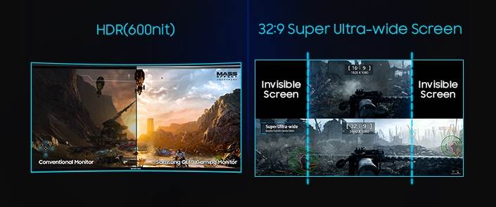 CHG90 bukvalno širi vidno polje unutar igre, svojim širokim dizajnom i kao najširi monitor u paleti Samsungovih monitora namenjenih video igrama. Ovaj monitor se može pohvaliti neverovatnom zakrivljenošću od 1800R sa ultra širokim uglom posmatranja, od 178 stepeni, čime se sadržaj može gledati sa bilo kog mesta u prstoru u kome se monitor nalazi. Samim tim, igrači više ne moraju da brinu o logistici, troškovima i smetnjama koje potiču od okvira monitora, što su sve problemi koji se javljaju kada se više monitora spaja u niz kako bi se dobilo šire vidno polje.