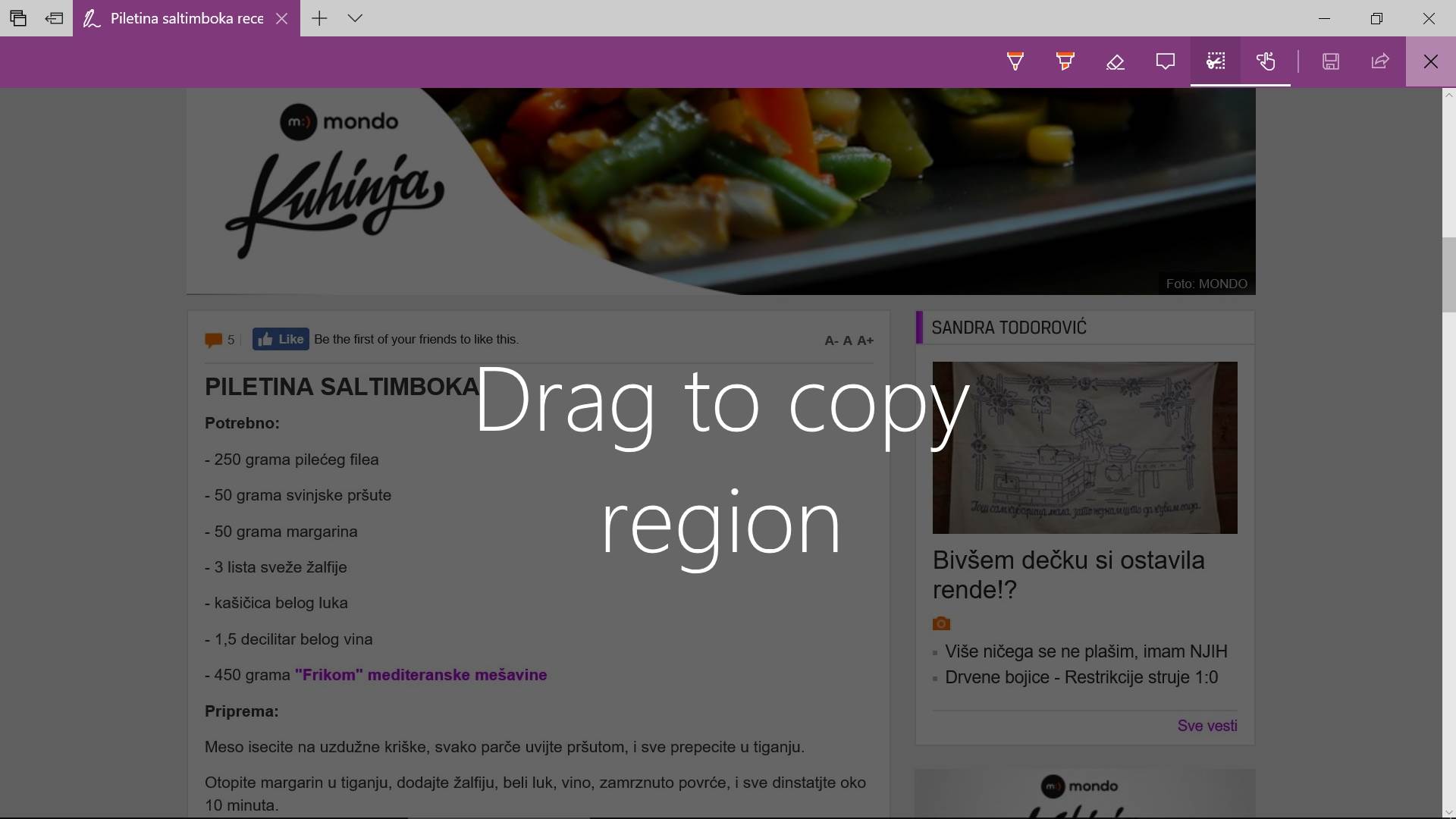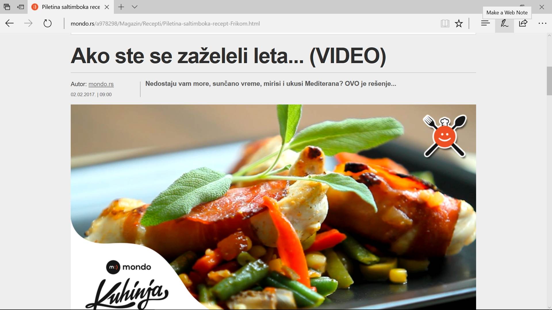 Otvorite Microsoft Edge, a potom pronađite neki novi recept u okviru MONDO kuhinje, koja sadrži sjajne recepte za pripremu zdravih, ali nezahtevnih i jela koja se brzo spremaju. Koristite opciju „Make Web Note“ u Edge pregledaču i izabrani recept odmah sa web-a podelite s prijateljima za koje kuvate putem Skype ili OneNote aplikacije.