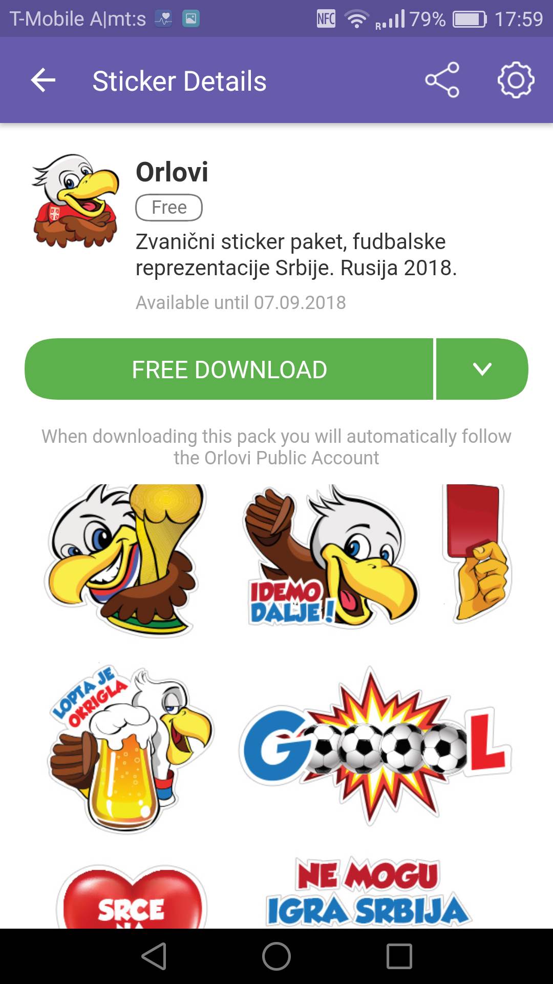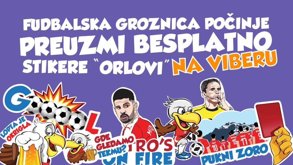 Besplatno preuzmite Viber stiker paket “ORLOVI” ovde, i postanite član istoimene Viber fudbalske Zajednice kako biste redovno primali sve bitne informacije o Fudbalskoj reprezentaciji Srbije, Mundijalu u Rusiji i učestvovali u kvizovima i nagradnim igrama priređenim ovim povodom.