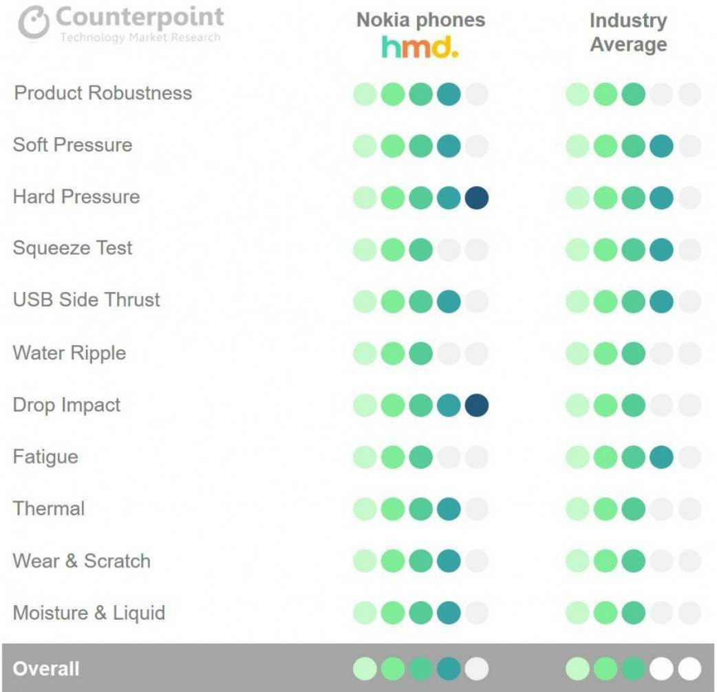 Samsung i Huawei su na 22% i 29% (mesečne zakrpe), što znači da većina njihovih telefona dobijaju zakrpe na kvartalnom nivou. 67% Xiaomi uređaja i 70% Realme telefona dobijaju na mesečnom nivou zakrpu. Procedure testiranja otpornosti telefona Nokia su oštrija nego od proseka ove industrije: "Evaulirano je na nekoliko kriterijuma, uključujući robusnost, merenje sile, pad i udar, izdržljivost, habanje i ogrebotine, termalni testovi, vlažnost i likvidni testovi, kao i ostale koje uključuju kvalitativne i kvantitativne obzervacije!" - ističe saradnik direktora kompanije Counterpoint Research, Tarun Pathak.