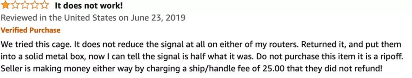 „Uređaji koji su prethodno bili udaljeni od rutera svega nekoliko metara i koji su imali signal, sada se više ni ne povezuju. Morao sam da uklonim ovaj kavez od rutera da bi se signal povratio. Sada sam zapeo sa beskorisnim metalnim kavezom koji me je koštao više od sto dolara. Pokušaću da ga prodam na oglasima“ – dala je mušterija jednu zvezdicu.