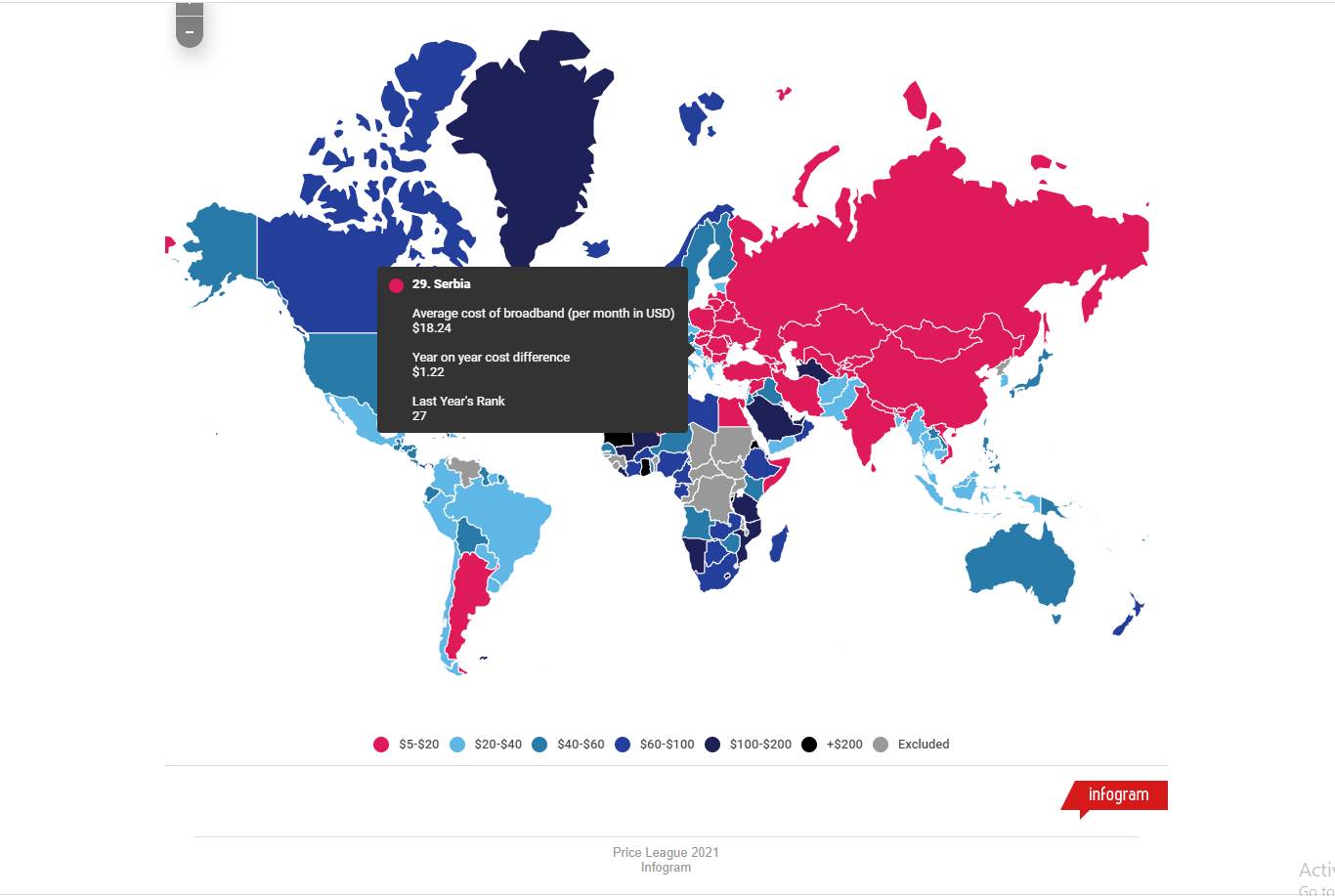 Ukrajinski paket širokopojasnog interneta košta samo 6,41 američkih dolara mesečno, dok je Srbija rangirana na 29. mestu (pali smo za dve pozicije u odnosu na prošlu godinu) sa cenom od 18,24 dolara mesečno. Bosna i Hercegovina se nalazi na 36, poziciji na ovoj rang listi sa prosečnom cenom od 21,67 dolara. Klikom na ovu rečenicu možete videti koju poziciju zauzima Srbija na listi rangiranih zemalja po brzini interneta.