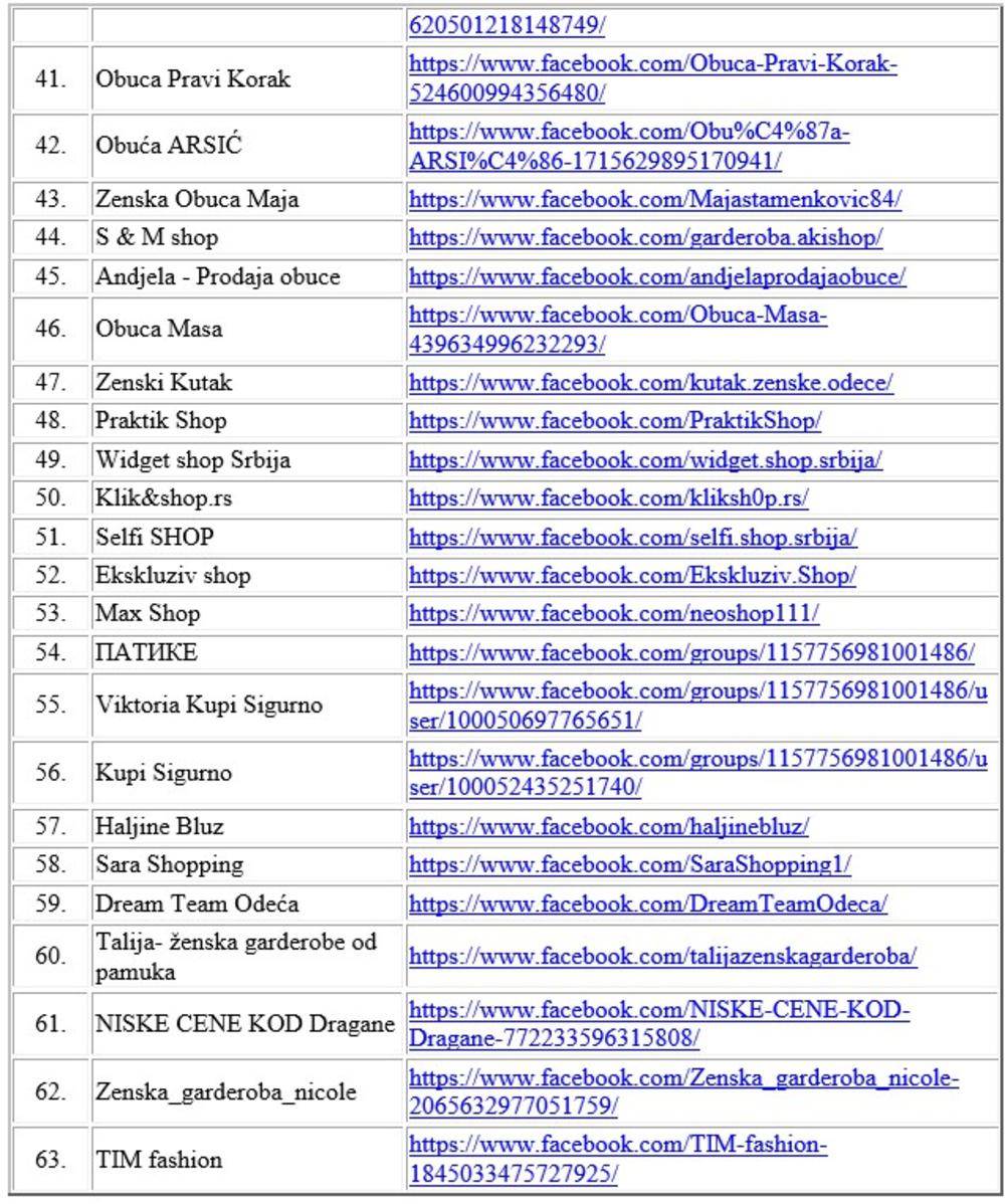 U najvećem broju slučajeva reč je o prodaji odeće i obuće, a u saopštenju ove dve organizacije za zaštitu prava potrošača se navodi da se do liste, koja nije konačna, došlo na osnovu provere nekih trgovaca na društvenoj mreži Facebook, što je rađeno u saradnji sa potrošačkim organizacijama članicama NOPS.
