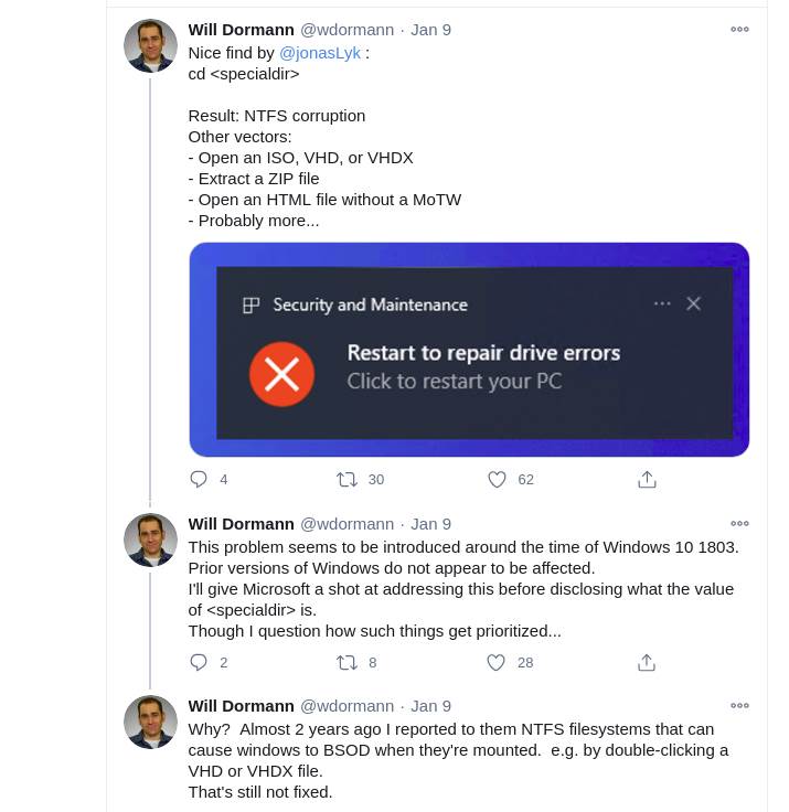 Vil Dorman, analitičar za ranjivosti na CERT Coordination Center je potvrdio da se ovo zaista događa, te da postoji još načina kako on može da se pokrene. Ističe da ova ranjivost na Windows 10 operativnim sistemima postoji skoro tri godine, te da je on prijavio ovaj problem pre dve godine, ali da još uvek nije popravljen, što znači da je ovaj problem bio i u pređašnjim verzijama, ali i u najnovijoj.