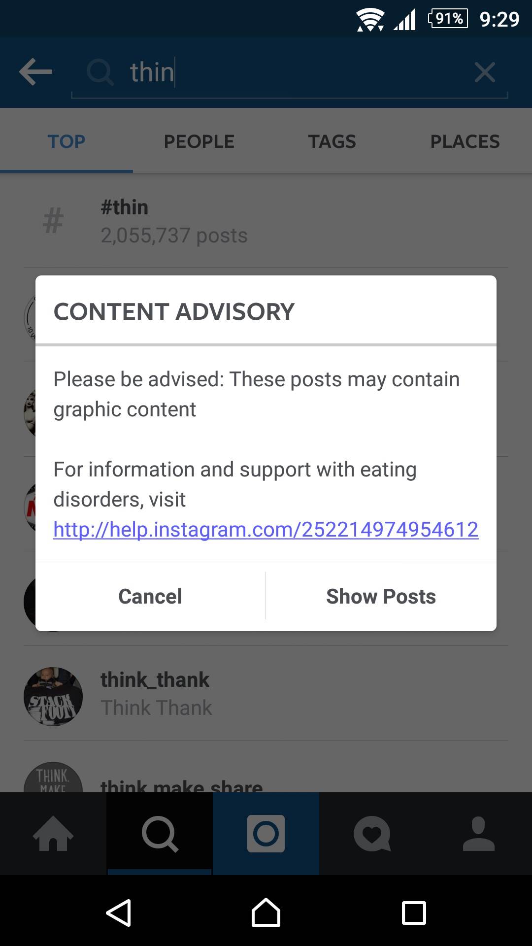 Izgleda da je reč #curvy zabranjena na ovoj društvenoj mreži. #Thin i #skinny (tanak, mršav) se mogu pretraživati, ali dolazi i upozorenje kada kliknete na haštag.
