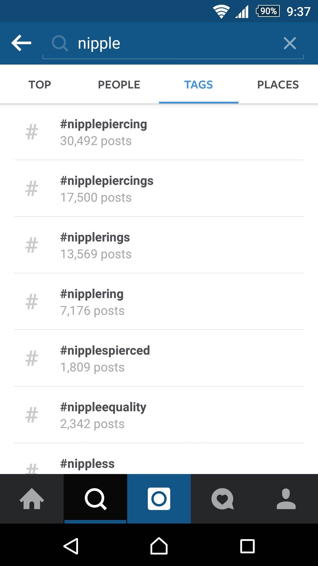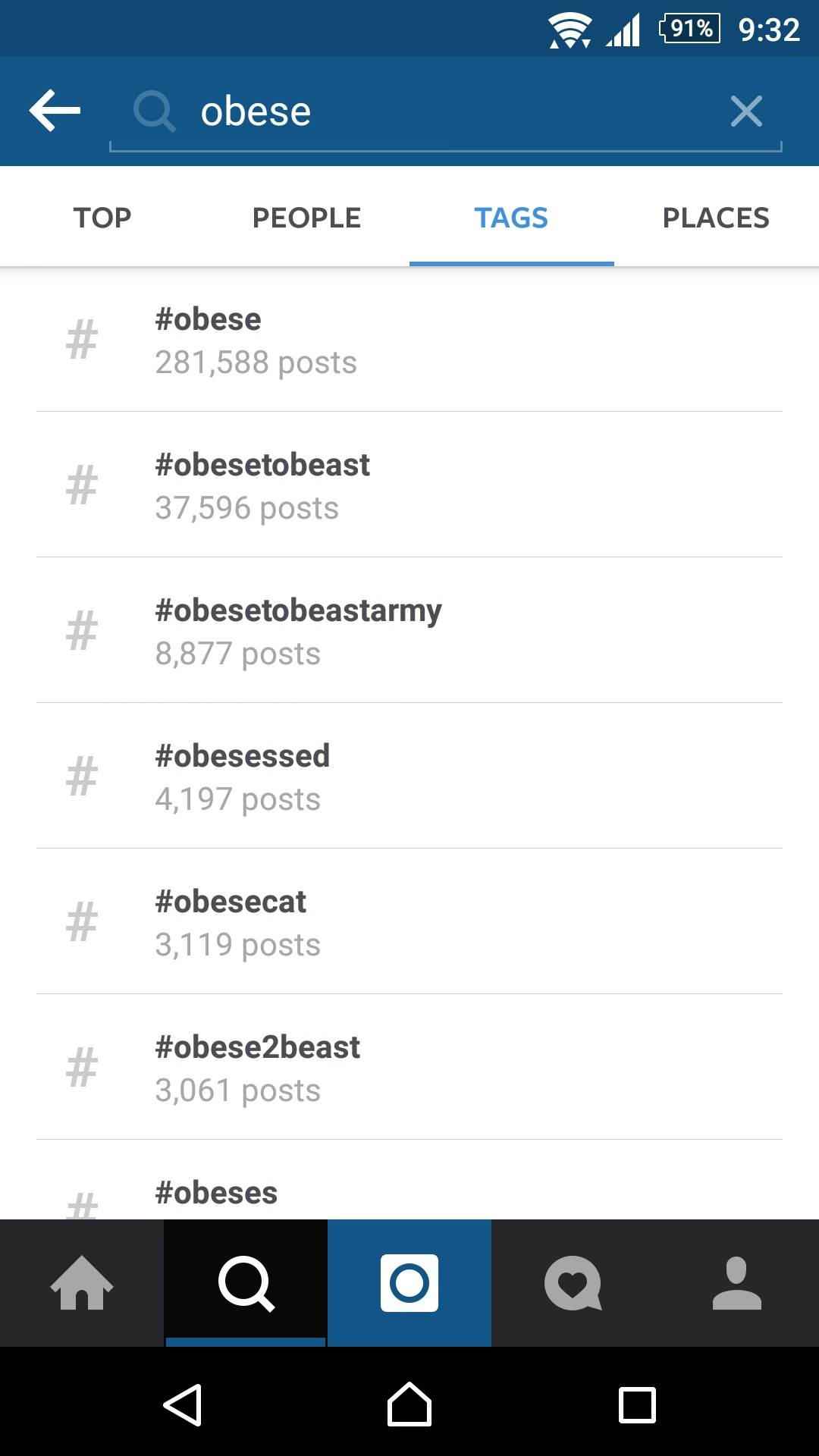 #fat i #Obese (mast, gojazan) takođe možete pretraživati. Neki delovi tela su takođe izbačeni iz pretrage. Kao na primer #butt ili #thighs (zadnjica, butine). #nipple (bradavica) takoše nije dostupna u pretrazi.
