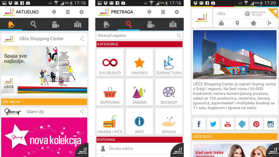 Šoping centar Ušće dobio je modernu, atraktivno dizajniranu aplikaciju, koja će vam, kao sveobuhvatan vodič i digitalni planer pokazati gde su locirane prodavnice unutar centra, odvesti vas do parkinga ili do svake od prodavnica i restorana, dojaviti vam gde su sniženja i prikazati vam bioskopski repertoar.