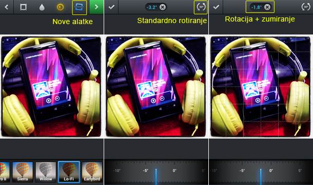 Fotografije sada možete jednostavno rotirati za 90 stepeni ili stepen po stepen rotirati uz istovremeni zum u fotku. Tako, recimo, možete rotirati sliku i za 3.1 ili birati rotaciju+zum u intervalu od -30 do 30 stepeni. Uveličanje ne možete da menjate, jer se ono automatski primenjuje u zavisnosti od izabranog stepena rotacije.