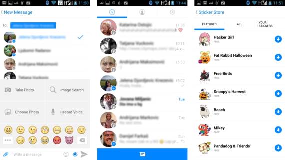 Smajliji mogu da se preuzmu iz Sticker Stora, direktno kroz Messenger aplikaciju. Takođe, unapređena je mogućnost slanja fotki, koja sada uključuje više opcija za izbor izvora fotke pa čak i pretragu fotki na internetu ili u telefonu. Umesto Google pretrage za slike sa na Facebookovom Messengeru koristi Bing.