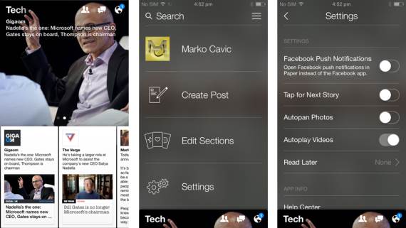 Ako želite da pristupite podešavanjima aplikacije učinite to prevlačenjem nadole u početnom displeju aplikacije. Otvara se meni sa podešavanjem vašeg Facebook profila i Paper aplikacije. Odatle možete aktivirati obaveštenja aplikacije na početnom displeju i zaključanom displeju iPhona, kao i druge opcije, koje su uobičajene.