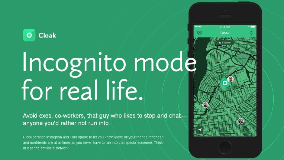 Cloak je jedinstvena aplikacija, koja omogućava korisnicima iPhone uređaja (za sada) da izbegnu susret sa bivšima, dosadnim kolegama sa posla, "onim" likom koji priča kao navijen, "prijateljima" i svima sa kojima ne žele da se sretnu. Na osnovu Foursquare i Instagram informacija Cloak pronalazi korisnikove prijatelje i pratioce i ucrtava ih na mapi Cloak aplikacije. Na taj način korisnik može da vidi otprilike gde se ko nalazi i da izbegne susret sa označenim osobama.