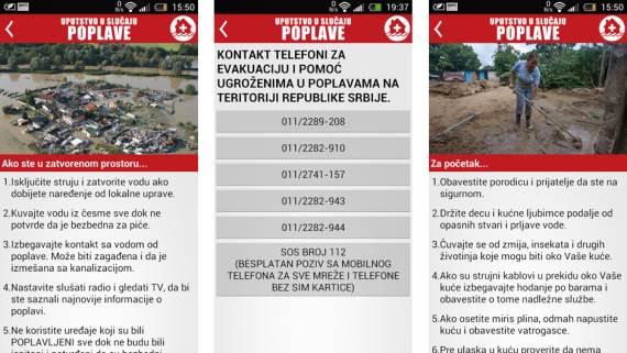 Aplikacija "Poplave" sadrži informacije kako se ponašati i pripremiti pre nego što do poplave dođe, za vreme poplave i šta raditi posle nje. Android aplikacija, takođe omogućava direktno pozivanje brojeva za evakuaciju i pomoć, a sadrži i proverene linkove ka sajtovima o informacijama o spisku evakuisanih osoba, o nestalim osobama, kao i o načinima za pomoć u vidu volontiranja i donacija ugroženima.