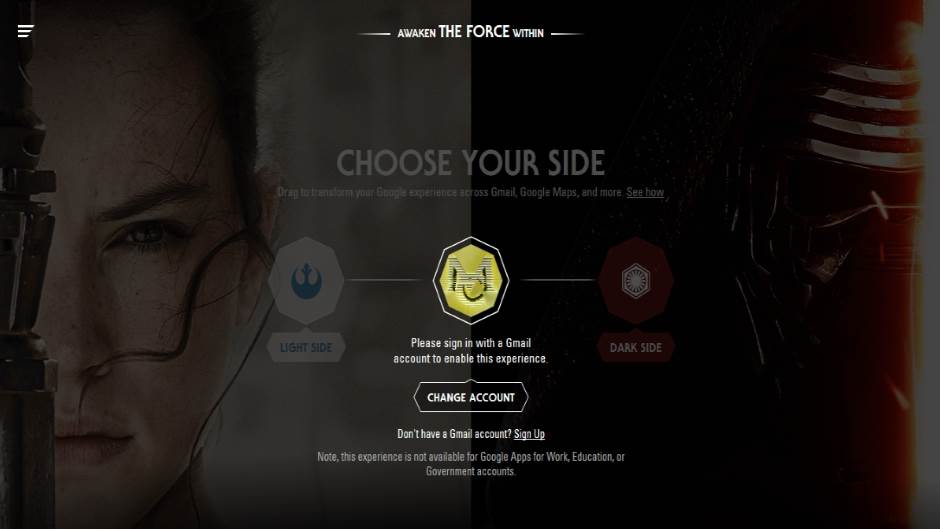 Naravno, moguće je odabrati stranu zla ili dobra (a Google meri koliko je i jednih i drugih), a mi smo ovog puta uzeli ovu mračniju :) Maskiranje u Star Wars motive ne radi na Google poslovnim, edukativnim i servisima za javne ustanove.