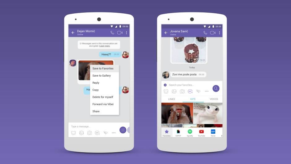 - Favorites: za korisnika čuvaju sve korisne i važne GIF-ove, linkove i YouTube video klipove na jednom pristupačnom mestu. Korisnici mogu da sačuvaju bilo koji GIF, link ili YouTube video klip, koji su dobili putem Viber-a u ovaj odeljak. Kasnije će mu ti sadržaji biti lako dostupni za deljenje jednim klikom na ekran.