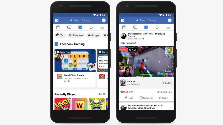 Games kategorija imaće višeznačnu ulogu - omogućiće igranje Facebook Instant igara, predstaviti korisnicima nove igre, ali i omogućiti da gledaju uživo i odloženo striming gejming partija svih igrača, koji to požele. Takođe, Facebook će kroz Games deonicu aplikacije plasirati i pretragu i promociju Games grupa, kako bi korisnici lakše pronašli grupe, koje razgovaraju o igrama, koje i oni vole. Sav ovaj upravo opisan sadržaj pojavljuje se omah ispod reda sa pet ikonica (ispod pretrage) i skrolovanjem levo-desno bira se Games podmeni, koji korisnik želi u tom trenutku.