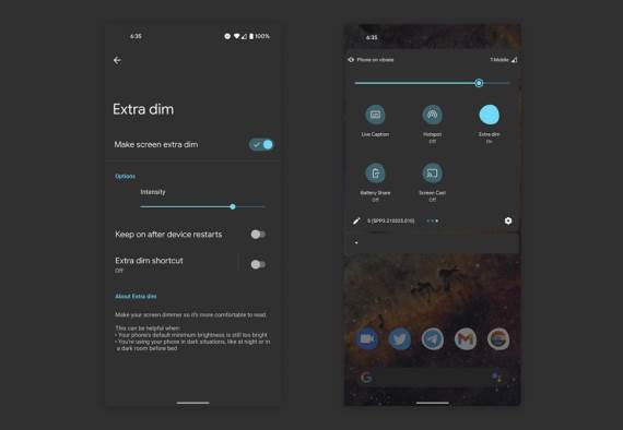 U Android 12 Developers Preview 3 Extra Dim opcija je dobila svoju prečicu u delu sa obaveštenjima, pa je ovu opciju moguće ostaviti aktivnom, sve dok je ne deaktivirate, pa čak i nakon restarta, prilagođavajući prikaz vašim potrebama. I Extra Dim ima svoj slajder za intenzitet zatamljivanja, pa je moguće prilagođavati koliko tamno želite da vaš ekran bude ekstra zatamljen.