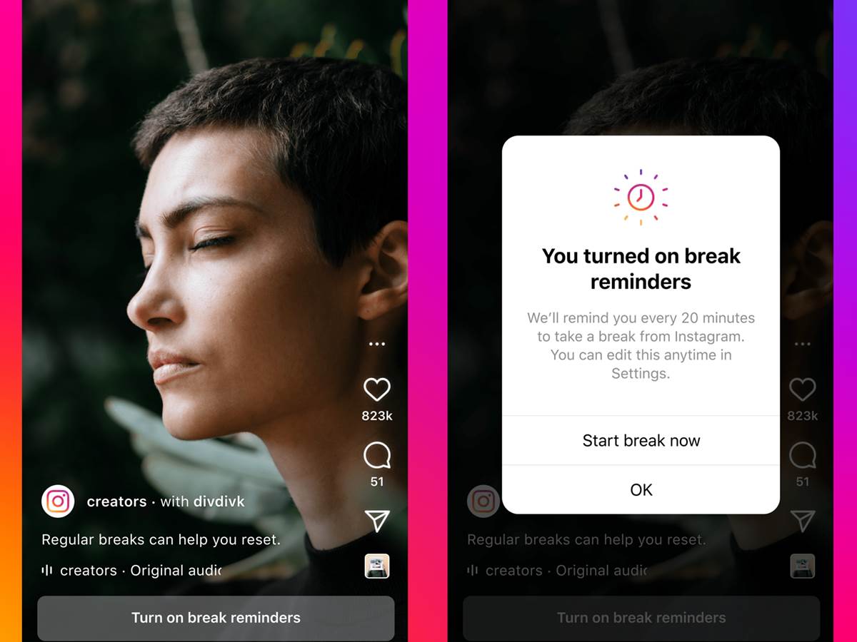 Instagram je takođe predstavio funkciju "Take Break", koja je prvobitno namenjena tinejdžerima koji provode vreme u sekciji Reels - nakon 20 minuta, korisnici će dobijati upozorenje da naprave pauzu od aplikacije. Ova funkcija je u fazi testiranja, a u toku leta se očekuje da bude dostupna svima.