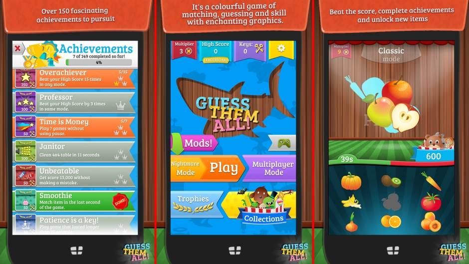 Igra se zove Guess Them All i u pitanju je puzzle/arcade naslov jednostavnog i zabavnog gejmpleja. Na jednoj polovini ekrana su sličice, a na drugoj njihove siluete i zadatak igrača je da utvrdi koja silueta odgovara kojoj sličici. Ne postoje nivoi, ali postoje "ostvarenja" čijim otkljčavanjem igrač dobija Ključićekoje koristi za kupovinu novih sličica. Zvuči jednostavno i pravila jesu jednostavna, ali igra postaje veoma izazovna kako igrač odmiče u pogađanju.
