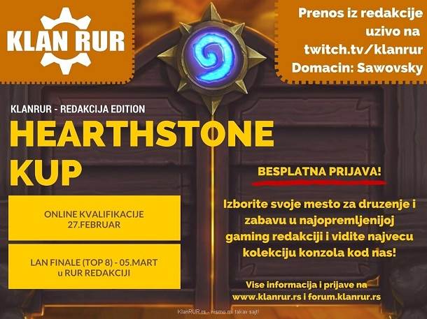 Prošle nedelje smo imali izuzetno uzbudljive i zanimljive kvalifikacije za veliki RUR Hearthstone kup, prvi koji organizujemo uživo u prostorijama naše redakcije. Preko sto takmičara se prijavilo za borbu do top 8 najboljih, mesto koje je značilo plasman na glavni događaj ove subote. Nakon 4 teška kola bo5 partija, na kraju smo dobili najboljih osmoro koji će u subotu biti gosti Klan RUR redakcije i boriti se za bogat nagradni fond, ali i titulu pobednika trećeg po redu Hearthstone takmičenja u organizaciji Klan RUR-a. Tih osmoro su: tjyky, Virus, Jojen666, Nerevarine, XoroN, Touche, Saranjivac i TheDeeKay.