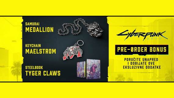Posebna ponuda za Cyberpunk 2077 igre naručene iz Srbije obuhvata ekskluzivan i u drugim paketima nedostupan Samurai medaljon, Maelstrom privezak za ključeve i prateću knjigu u čeličnom Tyger Claws pakovanju.