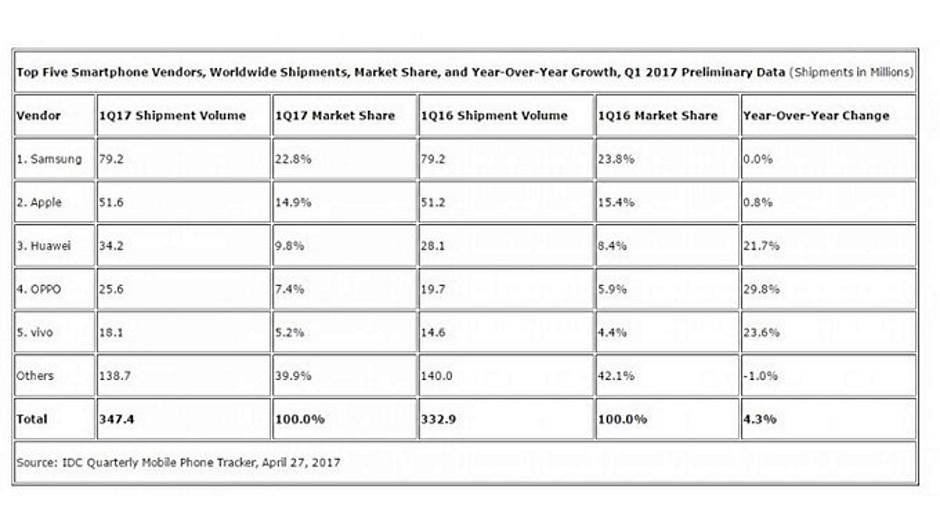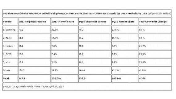 Samsung je u Q1 2017 periodu (januar, februar i mart) smanjio udeo na tržištu za jedan odsto, sa 23.8 pao je na 22.8 odsto. Kompanija Apple je u istom periodu zabeležila pad od pola procenta, sa 15.4 na 14. 9 odsto.
