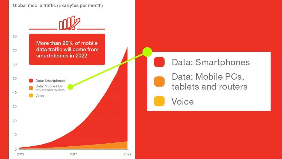 Korišćenje pametnih telefona i jednostavan pristup mobilnim internet servisima čini veliki deo podataka o mobilnom saobraćaju. Kompanija Ericsson analizira „prenos mobilnih podataka na pametnim telefonima“ bez „mobilnog data saobraćaja“ kako bi se ovaj trend jasnije ilustrovao. Do kraja 2022. godine, ukupan prenos mobilnih podataka na pametnim telefonima će porasti devet puta, i dostići će brojku od 66 ExaByte mesečno.