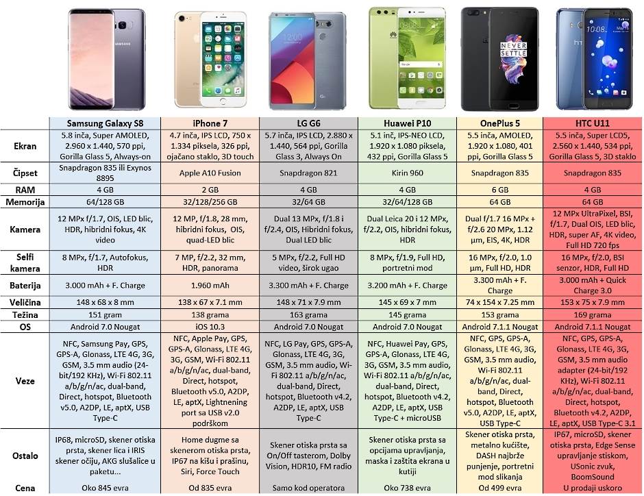 U uporednoj tabeli su ekrane i funkcije ukrstili „flagship“ modeli za prvu polovinu 2017. godine, i to sledeći uređaji pored OnePlus 5: