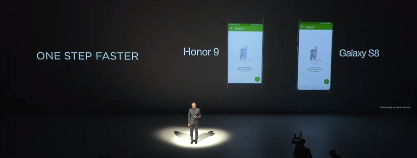 Koliko je, ako je verovati Honor objavi, Honor 9 brži od Galaxy-ja S8 - za korak! Ovaj nenaučni test, koji je Honor prikazao tokom premijere Honor 9 telefona, pokazuje da je Samsung Galaxy S8 zaista za korak sporiji od Honor-a 9 u domenu pokretanja aplikacija. Ipak, trebalo bi sačekati prve Benchmark testove, ali i testove bazirane na realnoj upotrebi, da bi se zaključilo da je zaista tako. Nedostaju test grafike, test multitaskinga, singl-core, multi-core performansi…