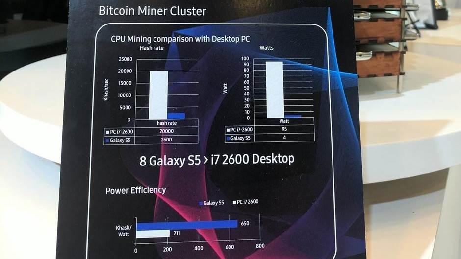 Na Samsung Developer Conference (Samsung Razvojna konferencija) demonstrirano je rudarenje Bitcoin-a pomoću 50 umreženih Galaxy S5 smartfona. Samsung je pošao od logike - zašto umreženi telefoni ne bi bili efikasni kao i PC koji namenski pravimo za rudarenje, vredan najmanje 2.000 evra.