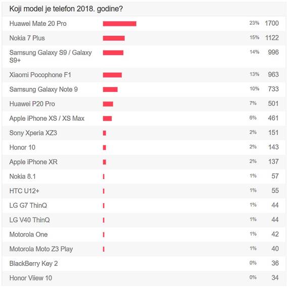 Nokia 7 Plus, dobila je preko 1.100 glasova, a šesto, sedmo, osmo i deveto mesto zauzeli su Huawei P20 i Huawei P20 Pro, Apple iPhone XS i XS Max, Sony Xperia XZ3 i Honor 10. Desetorku najboljih telefona u Srbiji, prema vašim glasovima, zatvara još jedan Apple model - iPhone XR, sa oko 130 glasova.