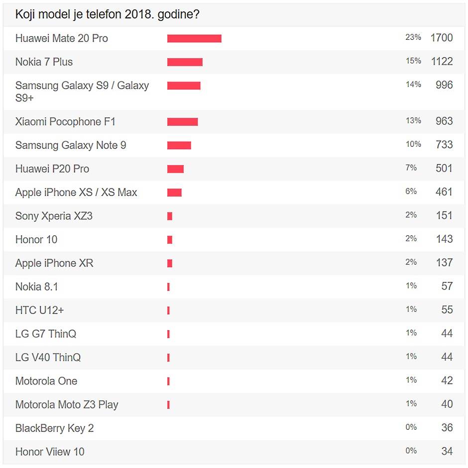Vi se, naravno, niste složili sa nama - šampionom ste, ubedljivim brojem glasova, proglasili Huawei Mate 20 Pro! Za “kineskog cara“ stiglo je preko 1.700 glasova, dok je Note 9 dobio nešto preko 700, što je dovoljno samo za peto mesto. Po vama je prvi do najboljeg Nokia 7 Plus, koja je u foto-finišu pretrčala Samsung Galaxy S9 i Galaxy S9+, koji je dobio preko 990 glasova, a Xiaomi Pocophone F1 osvojio ječetvrto mesto sa više od 960 glasova.