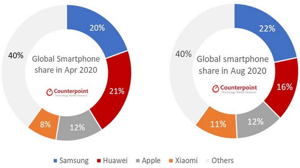 U odnosu na april i maj, kad je Huawei bio na vodećoj poziciji ta kompanija je izgubila oko pet procenata na tržištu prodatih telefona, Samsung je dobio dva, Apple ostao na istom, a Xiaomi je narastao za tri procenta, najviše u ovom periodu istraživanja tržišta.