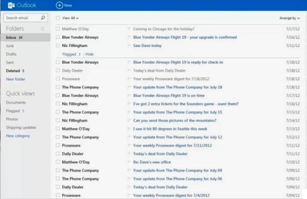 Mejlovi se prikazuju u najvećem delu redizajniranog interfejsa, a omogućen je i direktan pristup SkyDrive Cloud prostoru, Kalendaru i Kontaktima. Nažalost, oni još uvek nisu redizajnirani i ostali su u Hotmail izdanju, što pomalo kvari utisak.