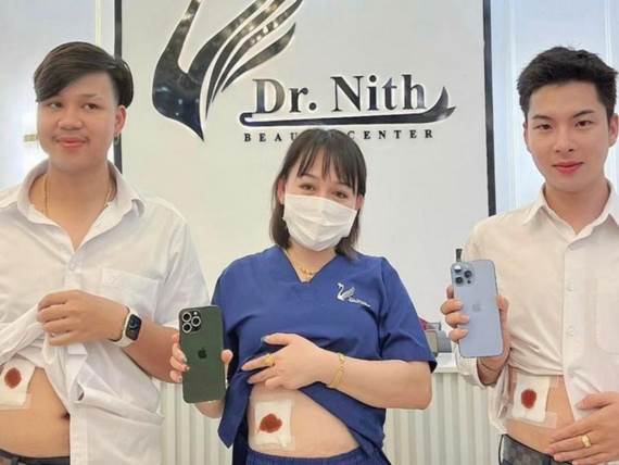 Klinika za lepotu i ulepšavanje na Laosu, Dr. Nith Beauty Center, objavila je sliku troje ljudi koji u ruci drže novi iPhone 14, a sa desne strane su im flasteri kroz koje je probila krv.