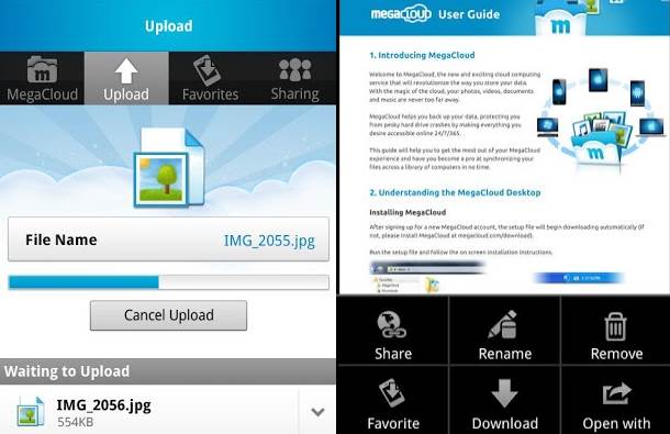 MegaCloud omogućava čuvanje muzike, slika, dokumenata i svih vrsta drugih i video fajlova. Umesto da memoriju telefona punite muzikom uradite to na MegaCloudu i odatle ćete, kao da je muzika na telefonu moći da je slušate preko svog muzičkog plejera (putem internet veze). Uz aplikaciju dolazi i tekst editor, pomoću kojeg možete napisati napomene sebi ili drugim korisnicima ili neke druge vrste tekstualnih poruka.