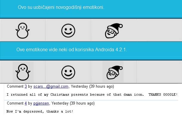 Na forumu Android zajednice pojavio se post jednog korisnika, koji je naveo da umesto uobičajenih ima tužne novogodišnje emotikone – nesrećnog Deda Mraza, ucveljenog Sneška Belića i druge “članove“ novogodišnje porodice.