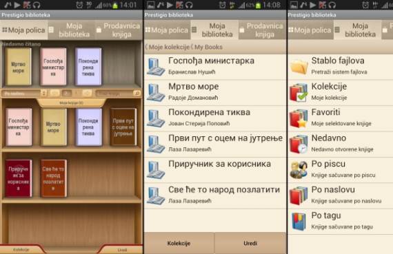 Aplikacija Prestigio eReader dostupna je korisnicima Android pametnih telefona sa verzijom softvera 2.0 i novijim, a trenutno je aktuelna verzija 3.0. Ona donosi preko 600.000 besplatnih i naslova koji se plaćaju, među kojima i preko 2.640 dela iz Srbije.