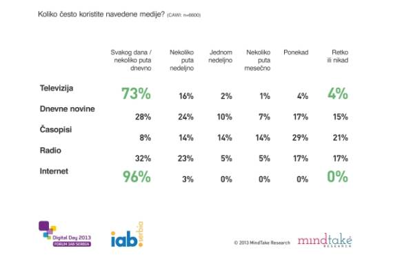 Na nedavno održanoj Digital Day 2013 konferenciji, predstavljeno je i internet istraživanje MindTake Research kompanije, sprovedeno od 30. aprila, do 10. maja, na 12 vodećih portala. Ovo istraživanje pokazalo je da po načinu korišćenja interneta, kao i navikama koje korisnici iz Srbije ispoljavaju tokom surfovanja netom, nimalo ne zaostaju za korisnicima Zapadne Evrope i rezvijenijih regiona.