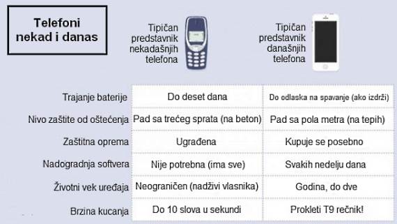 Tehnologija jeste napredovala, bez pogovora, ali je taj napredak doneo krhkije i telefone kojima baterija traje daleko kraće. Iako su jači i brži, novi telefoni nisu ni prineti starijim modelima, što se osnovne funkcionalnosti tiče.