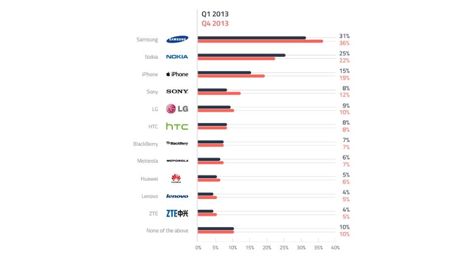Global Web Index u rezultatima svoje internet ankete u kojoj su učestvovali ispitanici od 16 do 64 godine iz celog sveta, otkrio je da je Samsung telefon u poslednjem kvartalu 2013. nosilo čak 36 odsto ispitanika, što je više od trećine populacije sa mobilnim telefonom! Nokia je jedina zabeležila pad i sa 25 odsto skliznula na 22 odsto. Apple je treći i taj proizvođač je zabeležio rast sa 15 na 19 odsto aktivnih korisnika. Svi ostali proizvođači zadržalis su stare pozicije, recimo HTC ili narasli u istom periodu. Odličan rast zabeležio je i Sony, koji je na tržištu stigao do 12 odsto aktivnih korisnika.