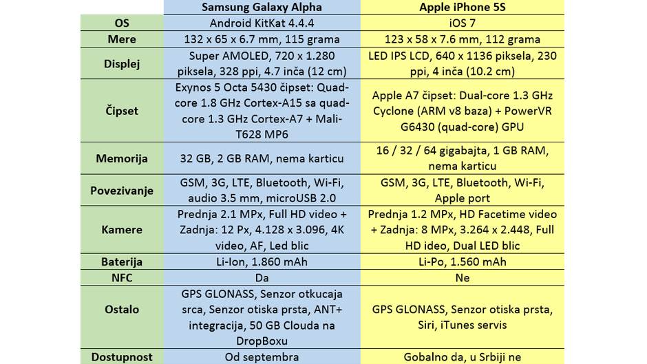 iPhone 5S pojavio se u septembru prošle godine, a Samsung Galaxy Alpha pojaviće se u septembru ove godine - premijeru očekujemo na IFA sajmu u Berlinu početkom meseca. Što se iPhona 5S tiče, on je već pred penzijom, jer će sva pažnja uskoro biti usmerena na iPhone 6, koji će biti predstavljen 9. septembra. Verovatno je Samsung iz tog razloga model Alpha i učinio ovakvim - unapređenog dizajna, ali i sa karakteristikama koje ostavljaju prostor za vodeći Samsung uređaj, koji će parirati novom iPhonu 6.