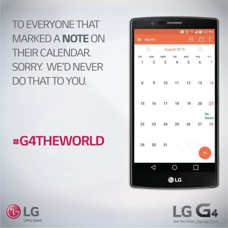 Iako je ova odluka čisto marketinška, kako su nam rekli u Samsungu, LG nije mogao da ne iskristi priliku, a da ne bocne Samsung: "Svima koji su NOTIRALI u svom kalendaru. Izvinite. Mi vam to nikad ne bismo uradili". LG na ovo čak gleda kao na priliku za dodatnu promociju, pa je uvedena i oznaka #G4TheWorld.