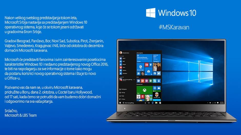 Nakon velike svetske i domaće prezentacije tokom leta, Microsoft u Srbiji nastavlja sa predstavljanjem Windows 10 operativnog sistema, koje će se tokom jeseni održavati u gradovima širom Srbije!