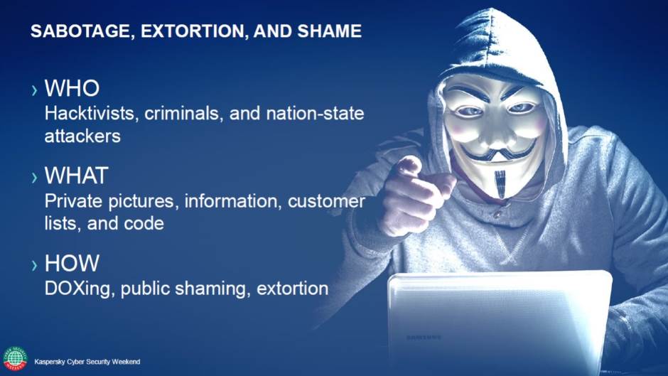 U 2015. godini, stručnjaci iz kompanije Kasperksy Lab primetili su povećan broj napada koji su imali za cilj krađu privatnih podataka, iznuđivanje i uništavanje reputacije, s obzirom na to da sve veći broj aktera koristi praksu objavljivanja kodova, privatnih fotografija, informacija i podataka o klijentima kako bi naneli štetu svojim žrtvama. Nažalost, stručnjaci iz kompanije Kaspersky Lab očekuju da će broj ovih napada dalje rasti u 2016. godini.