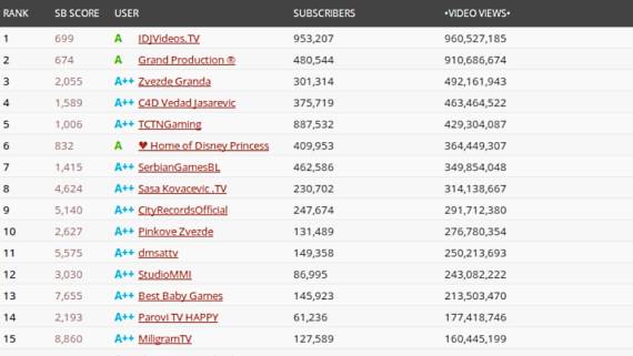 Portal SocialBlade objavio je listu najgledanijih YouTube kanala u Srbiji na kojoj dominiraju narodnjaci i rijaliti programi. Istina, tu su i edukativni i dečiji kanali, dok se popularni YouTuberi iz Srbije mogu sresti oko 20. mesta. Zoranahh je, recimo 62. po redu.