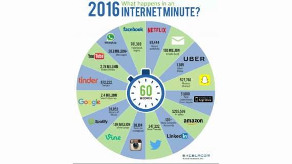 Minut na internetu nikad nije izgledao pretrpanije! Za samo 60 sekundi obavi se preko 2.4 miliona pretraga na Google sajtu, pogleda se 2.8 miliona videa na YouTube mreži ili obavi 1.390 Uber vožnji širom sveta.