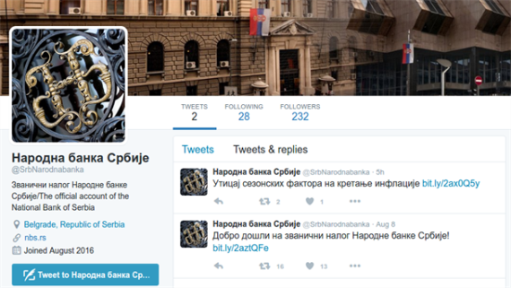Na Twitteru NBS korisnici (@SrbNarodnabanka) će moći da se informišu o aktivnostima iz nadležnosti centralne banke koje su predmet interesovanja medija, stručne i šire javnosti.