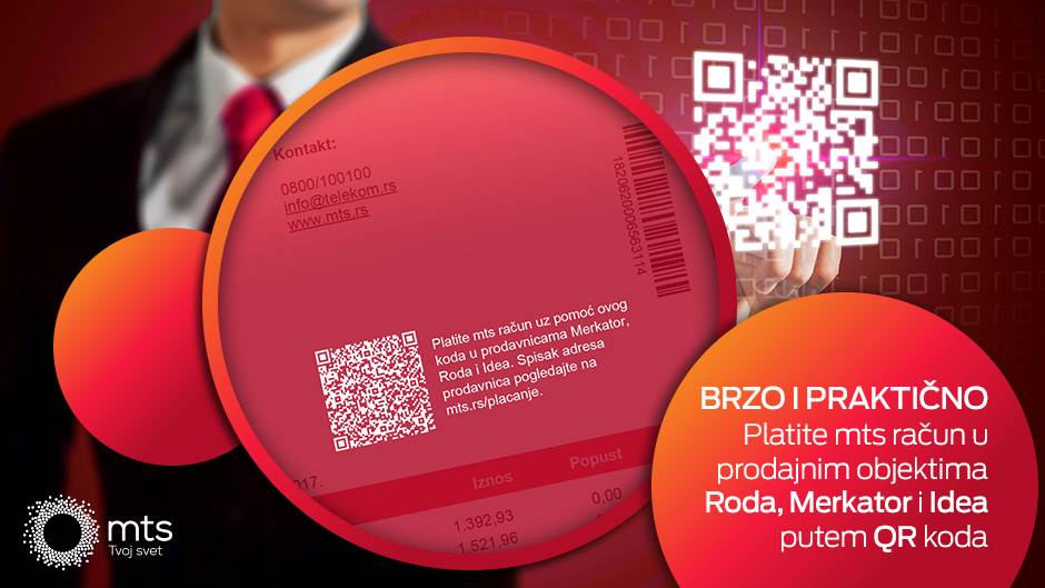 Ukoliko vaš mts račun za telekomunikacione usluge sadrži QR kod imate mogućnost da ga platite prilikom svakodnevne kupovine. Dovoljno je da na obeleženoj kasi ili info pultu, u prodajnim objektima Roda, Merkator i Idea, pokažete QR kod sa papirnog računa ili sa ekrana mobilnog telefona (ukoliko račun dobijate u elektronskoj formi). Prodavac će očitati kodirane podatke, a nakon plaćanja će vam izdati potvrdu o uplati.