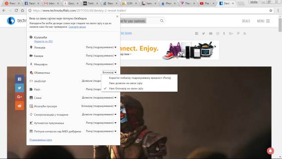 Klik na zvonce pokazaće vam kako da omogućite obaveštenja sa sajta na kojem se trenutno nalazite, ako ste greškom odabrali "Ne" u pomenutom prozoru, a obaveštenja možete da pokrenete i klikom na slovo „i“, smešteno odmah pre početka polja za upisivanje adrese sajta (ako pričamo o Chrome pregledaču).